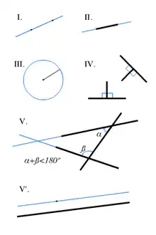 Постулаты Евклида представляют собой правила построения с помощью идеального циркуля и идеальной линейки[6]:
