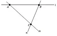 Структура инцидентности (P, L, I) состоит из множества P, элементы которого называются точками, множества L , элементы которого называются прямыми, и отношения инцидентности I между ними, то есть подмножества P × L, элементы которого называются флагами [2]. Если (A, l) — флаг, мы говорим, что A инцидентна l, или, что l инцидентна A (отношение симметрично), и пишем A I l. Интуитивно ясно, что точка и прямая находятся в таком отношении тогда и только тогда, когда точка лежит на прямой. Если дана точка B и прямая m, которые не образуют флаг, то точка не лежит на прямой и пара (B, m) называется антифлагом.