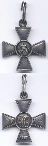 - Знак отличия Военного Ордена состоит в серебряном кресте, в кругу которого, на одной стороне, изображение Св. Георгия на коне, а с другой, вензели Св. Георгия и тот нумер, под которым имеющий сей знак внесен в список пожалованных оным.