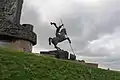 В настоящее время эта фигура в гербе Российской Федерации описывается как «серебряный всадник в синем плаще на серебряном коне, поражающий серебряным копьем чёрного опрокинутого навзничь и попранного конём дракона»[37], то есть без прямой ссылки на св. Георгия, и изображается без нимба.
