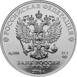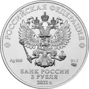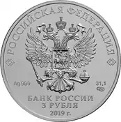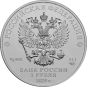 | 3 рубля | АЦ | серебро 999/1000 | 31,5 (±0,35)[7] | 31,1 (≈ 1 тройская унция) | 39 (±0,3) | 3,1 (±0,35) | 2009-2010, 2015—2019, 2020, 2021, 2022[5], 2023[2] | 880 000 |