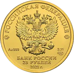 | 25 рублей | АЦ | золото 999/1000 | 3,20 (±0,08)[6] | 3,11 (≈ 1⁄10 тройской унции) | 16,00 (±0,12) | 1,30 (±0,20) | 2021, 2023[2] | 100 000 |