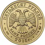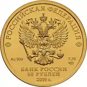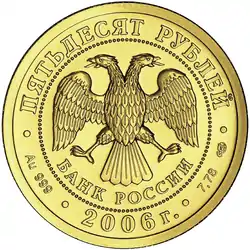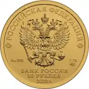 | 50 рублей | АЦ | золото 999/1000 | 7,89 (±0,10)[3] | 7,78 (≈ 1⁄4 тройской унции)[3] | 22,60 (±0,15) | 1,60 (±0,20) | 2006-2010, 2013[4], 2014—2015, 2018, 2019, 2020, 2021, 2022[5] | 4 250 000 |