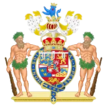 Герб Георга Датского основан на королевском гербе Дании, обременённом серебряным турнирным воротничком с девятью горностаями на трёх зубцах. Щит увенчан короной принца Датского с серебряным шлемом и горностаево-золотым намётом; шлем увенчан герцогской короной, увенчанной восстающим лазоревым, коронованным и вооружённым червленью львом[131]. Щитодержатели: на золотом основании два бородатых дикаря [лесных человека] с дубиной[132]. Щит окружён лентой ордена Подвязки: в лазоревом поле золотая надпись Honi soit qui mal y pense [Пусть стыдится подумавший плохо об этом].