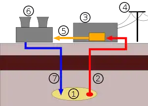 - Бинарная схема: в качестве рабочего тела используется не термальная вода или пар, а другая жидкость, имеющая низкую температуру кипения. Термальная вода пропускается через теплообменник, где образуется пар другой жидкости, используемой для вращения турбины. Такая схема используется, например, на геотермальной электростанции Ландау в Германии, где в качестве рабочего тела применяется изопентан.
