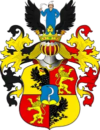 В расчетверённом щите накинут щиток, в голубом поле которого, над скалою о трех вершинах, серп острием вправо. В полях щита накрест золотых и красных: в первом, правая половина черного двуглавого орла; во втором, золотой коронованный лев влево; в третьем такой же лев вправо, а в четвертом, левая половина подобного как в первом поле орла.