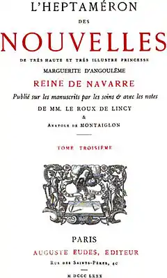 - Brantôme. Recueil des Dames, poesies et tombaeux. Paris, 1991. P. 183 Цит. по: А. Михайлов. «Гептамерон» Маргариты Наваррской и французская новелла эпохи Возрождения. // Гептамерон —М.: Республика, 1993, с. 5