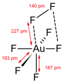 Как было доказано квантово-химическими расчетами, структура гептафторида золота на самом деле представляет собой лиганд пентафторида золота и фтора: AuF5·F2[2].