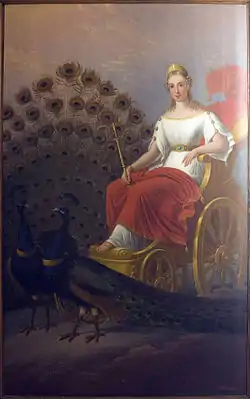Её обязательный атрибут — диадема, как символ того, что она главная из богинь. Посвящённым ей животным является павлин; пара павлинов везёт её колесницу[92].
