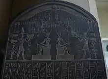 Двуязычная монументальная стела Птолемея VIII Эвергета, продемонстрированная 7 июня 2001 года, стояла в храмовом комплексе Гераклиона. Стела весит 10 тонн, имеет 6 метров в высоту и 3 метра в ширину. Когда её обнаружили, она была разбита на 15 фрагментов. Стела была установлена где-то между 141/140 и 131 или 124 и 116 годами до н. э. Поверхность стелы повреждена, греческий текст не может быть прочитан, но большую часть египетского иероглифического письма можно дешифровать и интерпретировать. В ней говорится о местных делах жрецов Гераклиона[17].