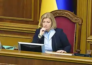 Ирина Владимировна Геращенко (укр. Ірина Володимирівна Геращенко; род. 15 мая 1971, Черкассы) — украинский государственный и политический деятель, журналист. Председатель фракции «Европейская солидарность» в Верховной Раде Украины с 29 августа 2019 года. Народный депутат Украины VI, VII, VIII и IX созывов с 23 ноября 2007 года.