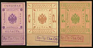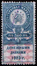 В РСФСР были сделаны три эмиссии гербовых марок. Первые марки поступили в обращение в 1922 году. Для второго, вспомогательного, выпуска в 1923 году были использованы марки первого выпуска, на которых была сделана надпечатка: «Дензнаками 1923 г.». Марки третьего выпуска РСФСР 1923 года были отпечатаны с применением технологии последнего выпуска Российской империи[10].