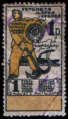 Известны три основных выпуска гербовых марок СССР и один вспомогательный выпуск (с надпечаткой). Для первого в 1924 году были использованы марки канцелярского сбора с надпечаткой слова «Гербовая». Второй выпуск 1924—1925 годов печатался двумя способами — литографским и типографским, на бумаге с водяным знаком «ковёр» и на тонкой белой бумаге без водяного знака. В 1926 году были изданы последние гербовые марки СССР. Начиная с 1930 года и до конца 1991 года в стране применялись единые пошлинные марки, заменившие многочисленные виды фискальных марок (кроме консульских), применявшихся ранее[10].
