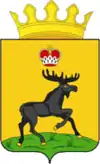 В пересеченном червлено-лазоревом поле серебряный олень с золотыми рогами и копытами, поднявший голову и стоящий на выходящей в оконечности золотой скале, во главе сопровождаемый возникающим золотым солнцем (без изображения лица), а в лазури — серебряными ромбами без числа. Щит увенчан золотой короной, соответствующей статусу района | 16 февраля 2009 | 4721 |