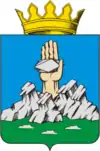 В лазоревом (синем) поле на зеленой оконечности, обремененной разбросанными серебряными камнями, низкая серебряная гряда скал, из-за которой выходит вверх рука, держащая серебряный кристалл ромбовидной формы. Щит увенчан муниципальной короной установленного образца | 30 сентября 2008 | 5054 |
