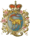В червлёном щите серебряный пояс; щит на груди чёрного двоеглавого орла с золотыми лапами и клювами и червлёными языками, коронованного двумя королевскими коронами, над которыми третья, императорская корона, с двумя развевающимися концами ленты[уточнить]. Императорский орёл держит серебряный меч с золотым эфесом и золотой же скипетр в правой лапе, и золотую державу в левой.