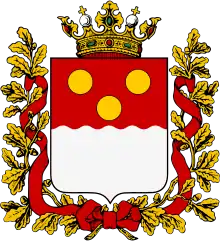 | Щит | четырехугольный, с закругленными нижними углами, заостренный в оконечности и пересечёный волнообразно геральдический щит |
