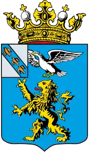 Геральдический щит французской формы, рассечённый вертикальной и горизонтальной линиями на четыре части. Правый верхний и левый нижний — чёрные. Левый верхний и правый нижний — зелёные. На этом фоне в центре щита размещаются фигуры восстающего золотого льва и над ним — серебряного орла. И лев и орёл обращены вправо.
