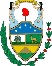 «Герб Республики Боливар представляет собой геральдический щит, который дважды пересечён, средняя часть рассечена. В верхней части изображено пять серебряных звёзд в синем поле, символизирующих пять департаментов, образующих Республику. В нижней части изображена гора Серро-Рико-де-Потоси в золотом поле, символизирующая богатства недр Республики. В центре справа в белом поле изображено хлебное дерево, растущее в горах Республики, символизирующее богатство флоры государства. В центре слева в зелёном поле изображена викунья, символизирующая богатство фауны государства. Щит увенчан фригийским колпаком, по сторонам от которого два гения держат ленту с надписью „Республика Боливар“»[4].