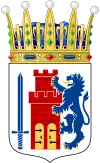 В серебряном поле червлёная крепость с зубчатой башней и двумя закрытыми золотыми воротами с чёрными петлями и замками, слева на неё восстающий лазоревый лев с золотыми языком, зубами и когтями, а справа — лазоревый меч остриём вверх.
