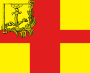 Желтыя, пересеченныя большимъ краснымъ крестомъ, и съ золотымъ изображеніемъ, въ верхнемъ углу, у древка, руки, съ мечемъ, выходящей изъ облаковъ и перерубающей змея[2]