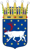 В усыпанном золотыми шестилучевыми звездами лазоревом поле бегущий серебряный северный олень с червлеными рогами и копытами.