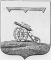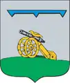В серебряном поле на зелёном холме — чёрная пушка на золотом лафете; на запале сидит золотая, со сложенными крыльями райская птица; ко всему добавлен лазоревый турнирный воротник (титло).