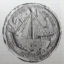 - До XIV века эмблема, используемая на городских печатях, представляла собой парусное судно когг. Высоко над носом корабля изображалась семиконечная звезда. Самое древнее сохранившееся до наших дней изображение этого герба датируется 1299 годом. На рубеже XIV и XV веков на печатях появился более новый тип корабля — остроконечный[2].
