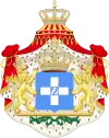 Герб Королевства Греция времен короля Георга II. Использовался 1936–1973 (формально, фактически в 1967-1973 вместо него и других монархических символов использовалась эмблема режима полковников, см. ниже)