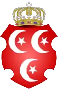 Герб Египетского Султаната 1914—1922 | Чтобы показать свою независимость от Османской Порты Мухаммад Али представил новый египетский герб с изображением полумесяца с тремя звездами на красном поле. Предполагается, что это должно символизировать победы его армии на трех континентах (в Африке, Азии и Европе), и его собственный суверенитет над Египтом, Суданом и Хиджазом. |