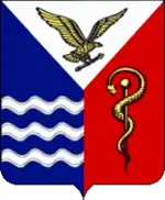 В щите — серебряный нитевидный скошенный «андреевский крест», разделяющий поле на четыре четверти, верхняя и нижняя из которых червлёные, а боковые лазоревые. В верхнем червлёном поле летящий вправо серебряный орёл с золотой булавой в лапах… В нижнем червлёном поле — золотая чаша на высокой ножке, обвитая золотой же змеёй, обращённой влево…Н. А. Охонько «Символы малой родины»[19]