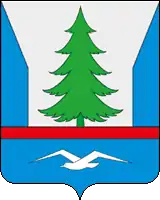 В серебряном поле на лазоревой оконечности, окаймленной червленью и обремененной чайкой в цвет поля, летящей вправо с распростертыми крыльями — зеленая ель между лазоревыми краями, верхние половины которых скошены к углам щита.