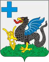 В пересечённом лазоревом (синем, голубом) и серебряном поле; вверху — золотой греческий крест; внизу — на зелёной земле чёрный дракон с золотым клювом, лапами и короной и с червлёными (красными) глазами, языком.