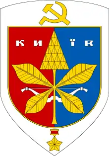Описание герба: двухцветный щит славянской формы. В голове щита размещены золотые серп и молот, символизирующие власть трудящихся, в подножье щита — наградной знак «Золотая Звезда», как знак статуса города-героя. Двуцветная сердцевина щита (красная — слева от зрителя и лазоревая — справа) воспроизводят цвета флага Украинской ССР, символизируя столицу. На красно-лазоревом фоне: сверху — серебряная надпись «Киев», серебряный лук — древний герб города и золотое изображение цветущей ветки каштана в стилизованном виде — символ расцвета современного социалистического Киева[14].
