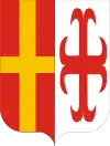 Дважды рассечённый и трижды пересечённый щит с красным подножием.