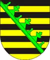 Герцогство Саксония (Sachsen): поле, разделённое десятью золотыми и чёрными поясами, со скошенным справа, в перевязь, зелёным (горбатым) рутовым венцом (Rautenkranz).