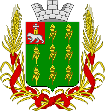 В лазоревом (голубом) поле серебряный рог изобилия, наклоненный вниз, из него сыплются золотые колосья разного хлеба.