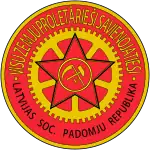 Герб Латвийской Социалистической Советской Республики (1918—1920 годы) | Герб Социалистической Советской Республики Латвии состоит из красной звезды, на которой в середине изображены — коса и молот, окружённые зубчатым колесом. Вокруг надпись: Социалистическая Советская Республика Латвия и «Пролетарии всех стран, соединяйтесь!» (статья 31 Конституции Социалистической Советской Республики Латвии 1919 года)[3] |