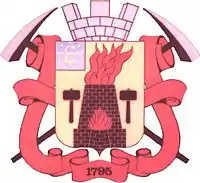 В золотом поле чёрная с золотыми швами доменная печь с красным пламенем, по бокам которой — по чёрному молотку. Доменная печь олицетворяет металлургию, которая оказывала влияние на становление и развитие города.