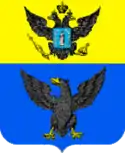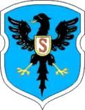 На голубом гербовом щите с вырезами по бокам („барочной формы“) чёрный гербовый орёл с золотым языком и лапами, с удлинённым „готическим“ хвостом[3]