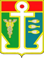 Герб имел следующее описание:«Щит рассечён зеленью и лазурью, глава червлёная. Поверх линий сечения положен серебряный якорь. В правом поле серебряный кадуцей, в левом три серебряные рыбы».