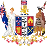 | Щитодержатели | Белая женщина с флагом Новой Зеландии и воин маори |