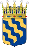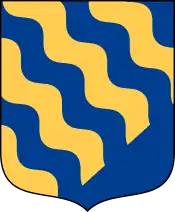 В скошенном справа волнисто 7 раз в лазоревые и золотые поля щите скошенная слева лазоревая основа.