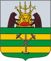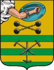 Герб города Петрозаводска состоит из щита, разделённого на две равные части. В верхней части щита на золотом поле изображены выходящая из правого бока, из лазурного облака рука, внутрь обращенная, держащая лазоревый овальный щит и сопровождаемая внизу четырьмя черными ядрами, соединёнными косвенным крестом из черных цепей. В нижней части герба Петрозаводска на разделённом 3 зелёными и 2 золотыми полосами поле изображены 3 железные молота, «в знак изобилия руд и многих заводов в сей области»[16].