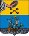 «Въ золотомъ щитѣ выходящая съ леваго бока изъ лазуревого облака, рука, внутрь обращенная, держащая лазуревый овальный щитъ, и сопровождаемая внизу четырьмя черными ядрами, соединенным таковымъ же изъ цѣпей косвеннымъ крестомъ. Щит увѣнчанъ Императорскою короною и окруженъ золотыми дубовыми листьями, соединенными Андреевскою лентою»[15].