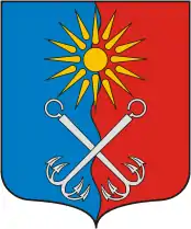 В волнообразно рассечённом лазурью и червлёнью поле, поверх всего — два пониженных серебряных речных якоря (лапами вниз) о четырёх зубцах накрест, сопровождаемые вверху отвлеченным золотым безантом. От безанта отходят шестнадцать отвлечённых золотых фигур, подобных остриям с дугообразно выгнутыми вершинами, остриями в стороны, уложенных попеременно в два сближенных ряда.
