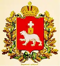 Герб Пермской губернии утвержден в 1856 году: «В червленом поле серебряный идущий медведь: на спине его золотое Евангелие, на коем серебряный крест с четырьмя лучами. Щит увенчан Императорскою короною и окружен золотыми дубовыми листьями, соединенными Андреевскою лентою»[3].