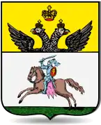| «Щит разрезан надвое: в верхнем, золотом поле, возникающий государственный орел; в нижней части — в серебряном поле, старый Полоцкий герб: на коне воин, держащий в правой руке саблю, на левой руке надет красный щит с двойным крестом». (П. П. фон Винклер) |