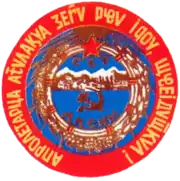 С 1938 года абхазская письменность была переведена на грузинский алфавит, а в 1954 г. — на кириллический, что отражалась и в надписях на гербе.
