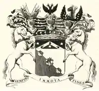 В поле, скошенном серебром и червленью, между процветшими лилиями переменных цветов, положенными поверх деления сообразно щиту, — волнистый пояс, переменяющий цвет с серебра в финифти на лазурь в металле и опрокинуто-пронзённый в левую перевязь золотым мечом.